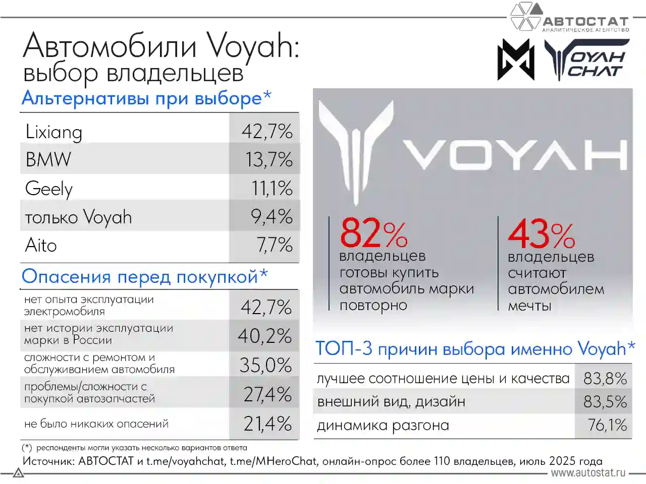Львиная доля владельцев автомобилей VOYAH готовы к их повторной покупке. Об этом в ходе совместного онлайн-опроса агентства «АВТОСТАТ» и телеграм-каналов VOYAH Chat и M‑HERO Chat сообщили 82% респондентов. Кроме этого, 43% владельцев VOYAH считают его автомобилем мечты.