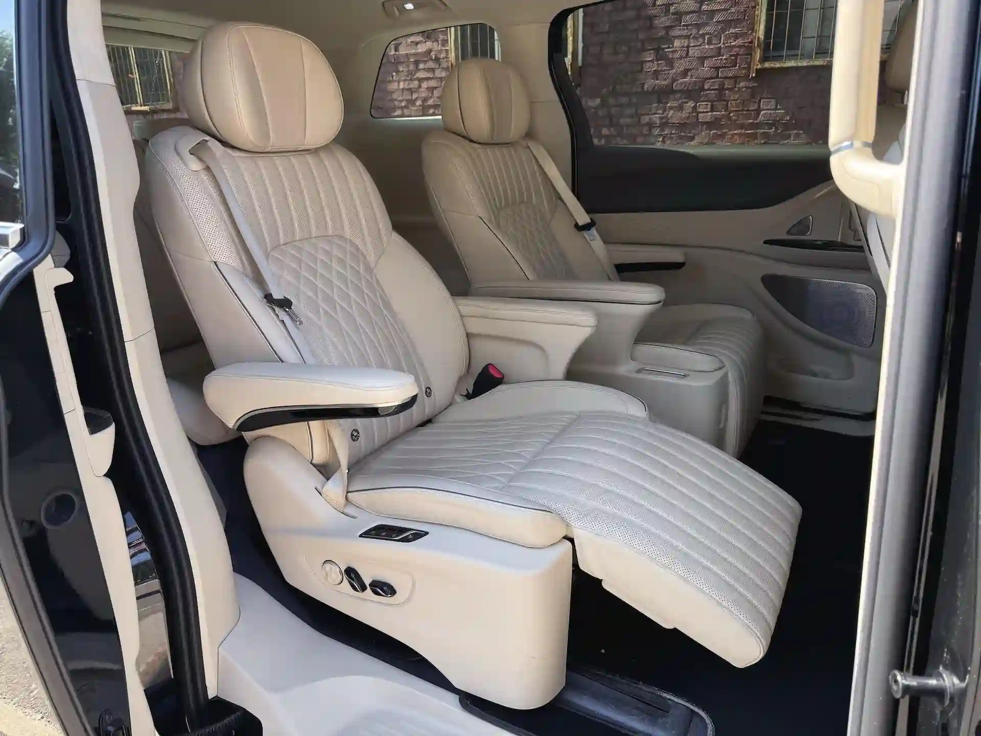 У отдельных «тронов» второго ряда есть выдвижная подставка для ног, вентиляция, подогрев, массаж… Салон отделан экокожей хорошего качества — мягкой, в меру толстой, с перфорацией и красивой прострочкой. Выглядит дорого. Впечатление усиливает ароматизатор с выбором из трех запахов. Сдвижные двери, конечно же, с электроприводом.