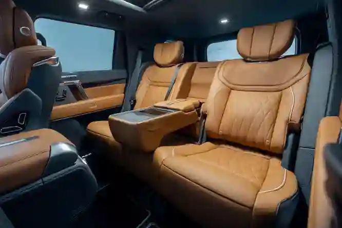 А вот от интерьера впечатления неожиданные. Посадка водителя на редкость удобна. Тумблеры на центральной консоли выполнены в авиационном стиле – один выполняет функции селектора трансмиссии, второй отвечает за настройки противобуксовочной системы, между ними – выбор уровня подвески. Графика щитка приборов – как в компьютерной игре. Дверные ручки стилизованы под пистолеты; на педаль газа нанесена пиктограмма play, на педаль тормоза – pause. Декоративные вставки из матового дерева, кожа сидений добротная, у кресел есть и подогрев, и вентиляция. Так что салон, бесспорно, хорош – с настроением. Жаль только, что для ног пассажиров второго ряда места маловато, но этот недостаток можно признать несущественным.