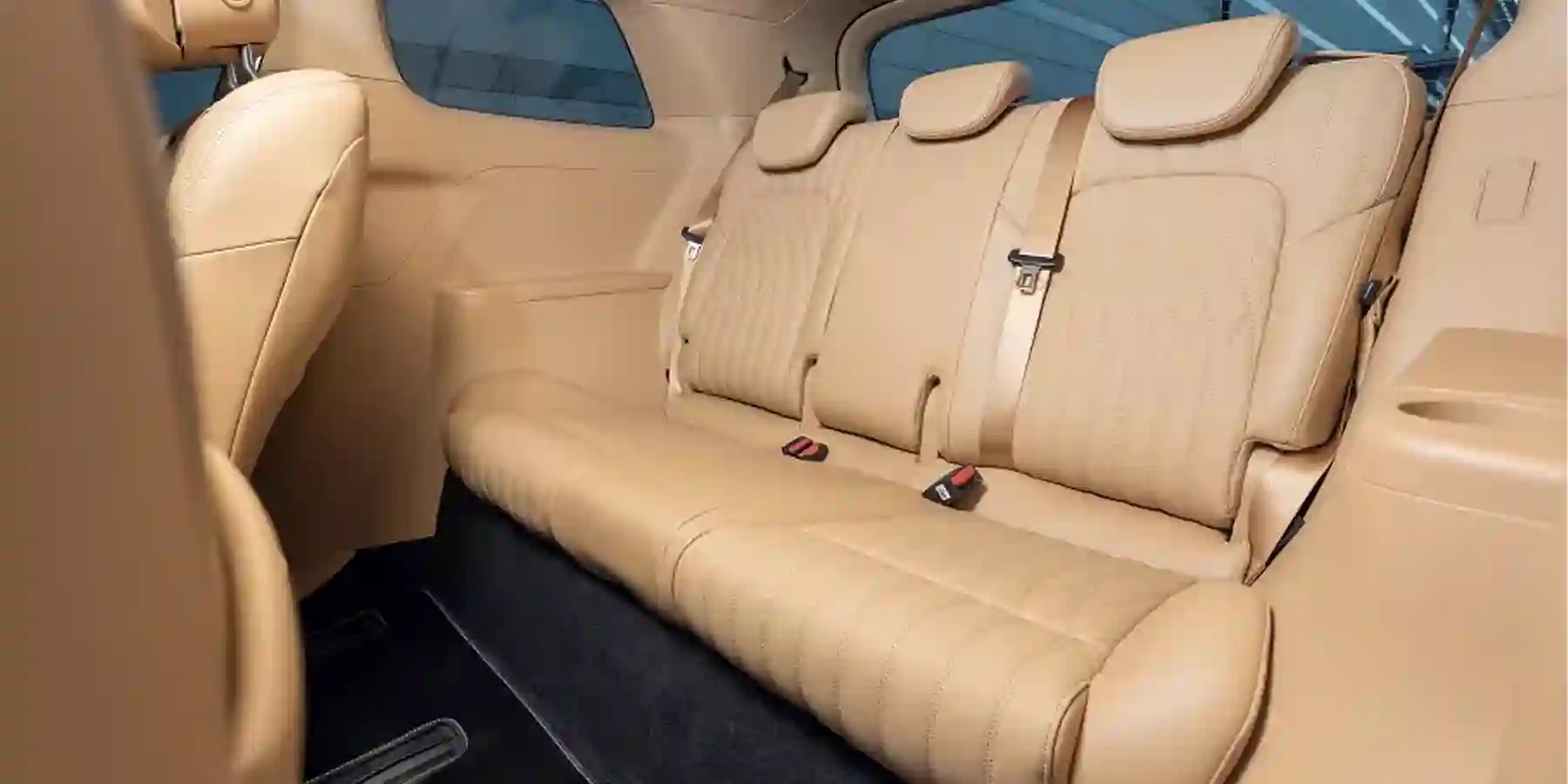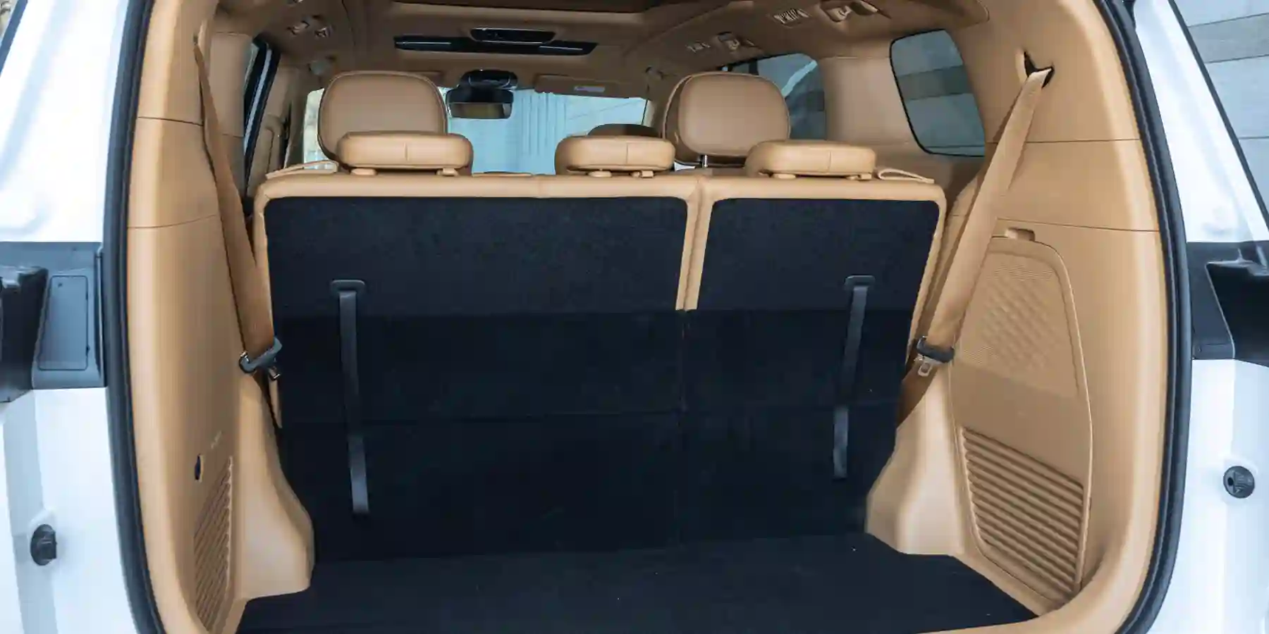 Второй ряд — это два отдельных кресла с оттоманками, подогревом, вентиляцией и даже массажем (все режимы включаются физическими кнопками). Для всех направлений предусмотрены электрорегулировки за исключением продольного. Двигать сиденья вперед-назад придется вручную, что не так уж и просто, потому что они тяжеленные. Полностью откинуть спинки тоже нельзя, и забраться на третий ряд можно только протиснувшись посередине, между креслами второго ряда, пригнувшись и задевая ногами за подлокотники.